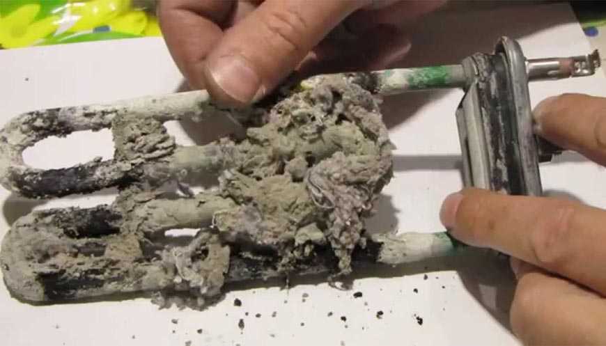 Бывают случаи, когда очистить ТЭН возможно только вручную. Окончательное решение принимается после осмотра нагревательного элемента. Если обнаружились многослойные отложения, то стандартные средства очистки не годятся. После такой процедуры множество твердых частиц останется внутри агрегата и нарушат его нормальную работу.