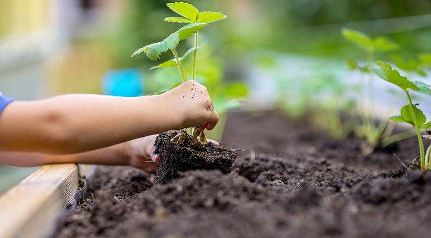 Обрезав питание, растение быстрее приспособится получать из почвы всё необходимое с помощью собственной корневой системы. Подберите для клубничных саженцев солнечное и безветренное место на участке. Почва должна быть рыхлой. Прекрасно для клубники подходит супесчаный или суглинистый грунт.