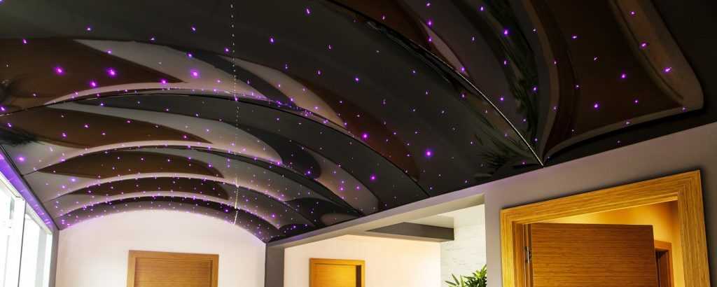 - полупрозрачными полотнами можно имитировать, при правильно встроенных светильниках, эффект дневного освещения. Они монтируются под перекрытиями, во время установки каркаса, а затем устанавливается пленка;