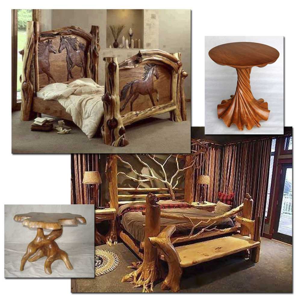 - Стулья и столики, для изготовления которых применяют старые пни подходящего размера с предварительно снятой корой. Особенно эффектно такие предметы смотрятся рядом с мебелью, покрытой кожей.