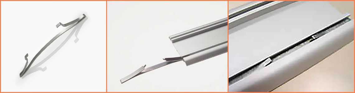 Удерживание дверей шкафа на месте достигается за счет такого элемента фурнитуры, как стопор-фиксатор. Он представляет собой металлическую скобу, которая вставляется в паз, служащий направляющим для роликов двери. Скоба имеет 2 усика, между которыми образуется углубление. Попадая в него, ролик фиксируется на месте и предотвращает тем самым самопроизвольный откат двери.