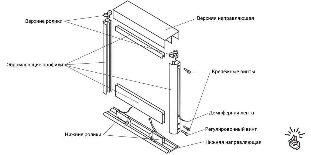 Схема устройства алюминиевых дверей купе с верхним подвесом