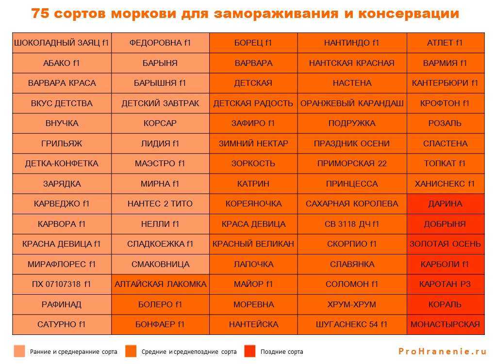 Современные сорта моркови, подходящие и для замораживания, и для консервации, представлены в таблице: