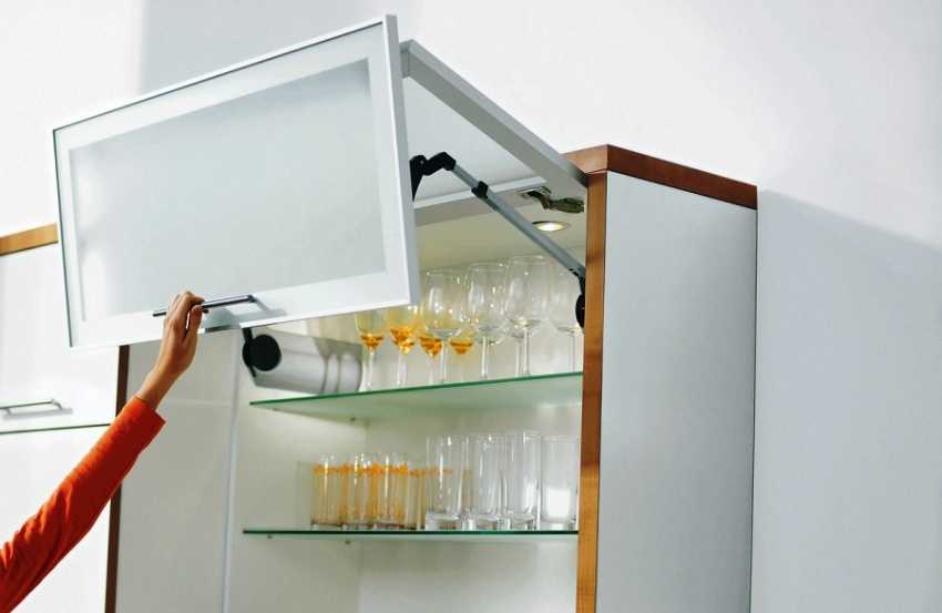 На дверях для кухонных шкафов, открывающихся вверх или вниз, устанавливаются подъемные механизмы. Такие устройства редко используют для распашных систем. Подъемные механизмы характеризуются надежностью и долговечностью. Они представлены в четырех разновидностях: пружинные, пружинно-масляные, газовые и электрические.