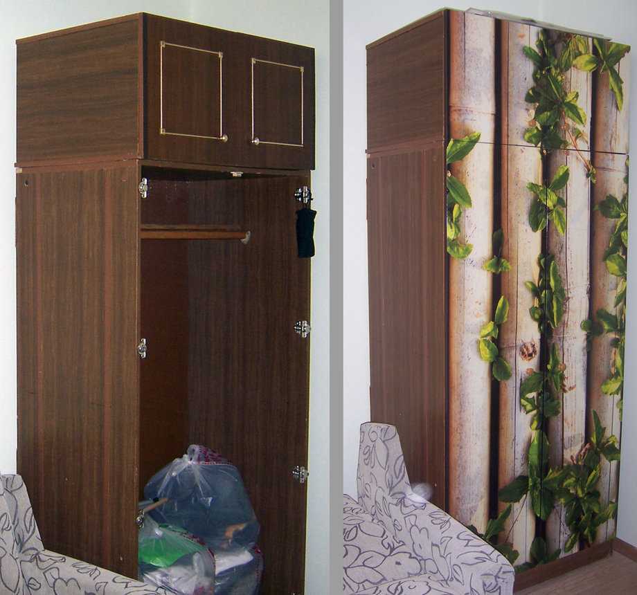 Это заставляет задуматься о том, как обклеить шкаф обоями и можно ли выполнить отделку из какого-то другого материала (ткань, краска, мозаика, самоклеющаяся пленка, фотообои и так далее). Имеет ли смысл украсить весь шкаф полностью или можно обновить только двери?