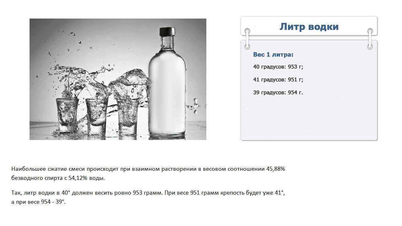 Если взвесить литр водки хорошего качества без учета ее тары, вес в идеале должен составлять 953 грамма. Допускается погрешность в пределах 2-х граммов, однако, если разница в ту или другую сторону больше указанных параметров, значит продукт содержит вредные примеси, либо разбавлен водой с нарушением технологии производства.