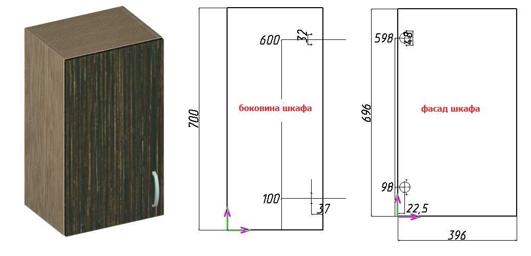 Существует общая схема, как установить накладные петли на шкаф с диаметром чаши 35мм. Удобнее ее представить на примере кухонного шкафа высотой 700мм и шириной 400мм с фасадом 696х396мм соответственно.
