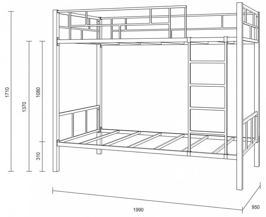 Двухъярусная металлическая кровать выдерживает большой вес и подходит для взрослых