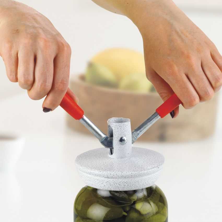 1. Автомат. Машинка достаточно проста в использовании и не требует особых навыков. Надеваем на нее крышку, потом, прижимая, поворачиваем рычаги по кругу пару раз. К горлышку банки крышечка прижимается пружинками, которые находятся во внутренней части ключа. Вся процедура закрутки ключом-автоматом займет не больше полминуты.
