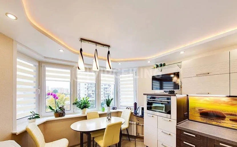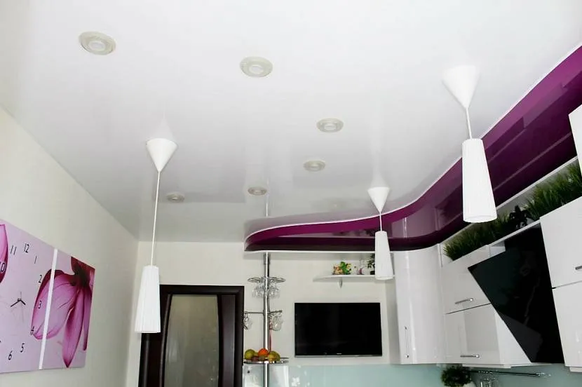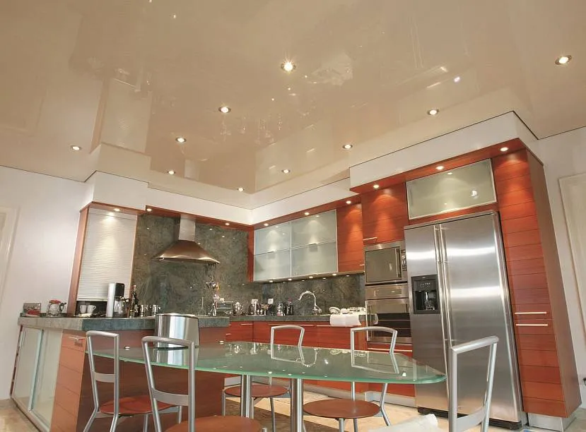1. Натяжной глянцевый потолок на кухне наиболее практичен: