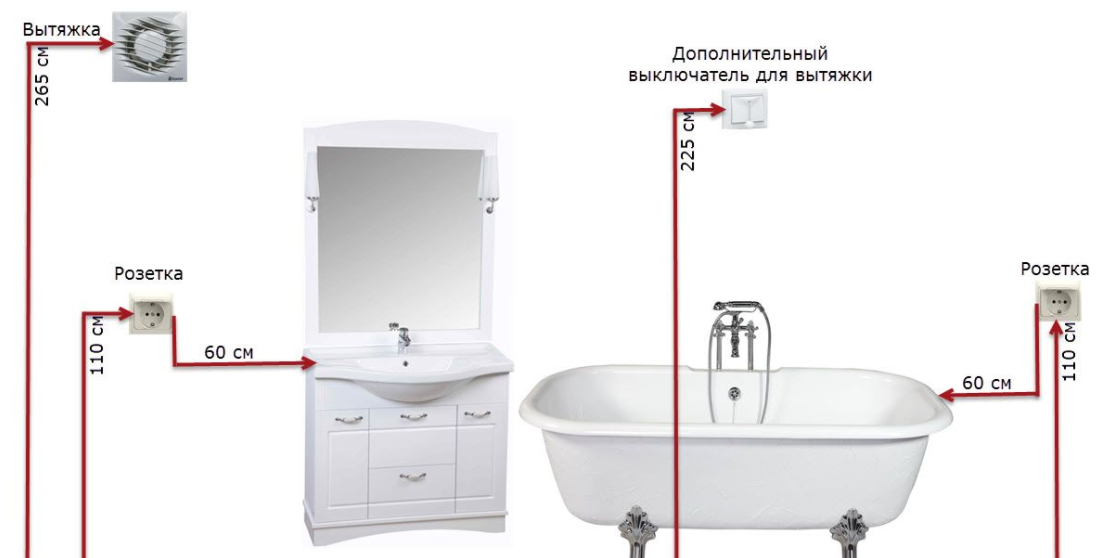 Из-за высокой влажности для безопасности важно монтировать их выше, нежели в других комнатах. Первую розетку устанавливают около зеркала на расстоянии 1 м