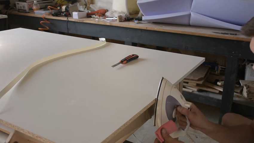 Подготовьте отрез фанеры для будущего изголовья и обклейте его боковые части лентой с помощью нагревания утюгом. Излишки срежьте канцелярским ножом. |