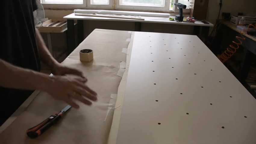 Просверлите углубления сверлом (10 мм). Затем разделите малярным скотчем разделенные части на фанере. Ту сторону, которая остается без отверстий, накройте бумагой и зафиксируйте ее. |
