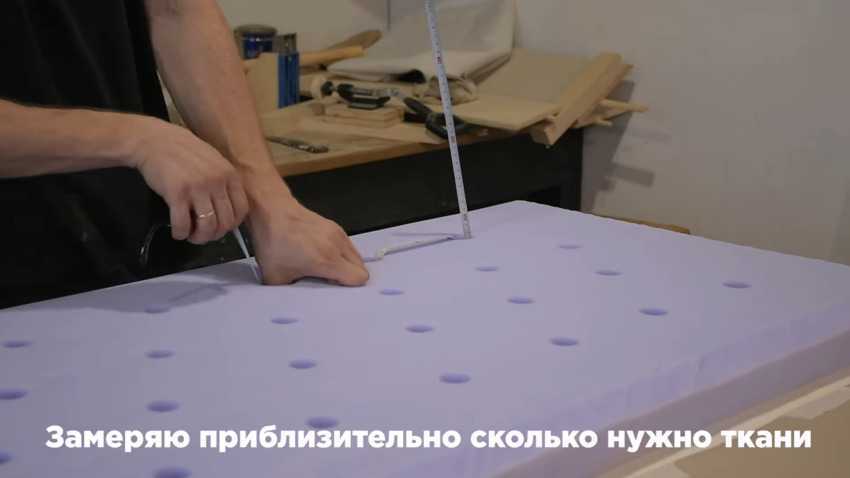 С помощью метровой ленты замерьте примерную необходимую длину обивочного материала, вставляя ее в углубления. |