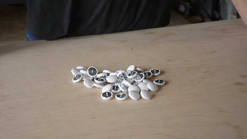 Подготовьте крупные круглые металлические пуговицы для каретной стяжки, на которых закрепите обивочный материал с помощью специального оборудования, выполняющего роль пресса. |