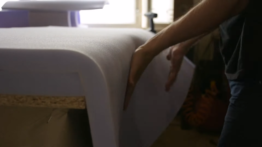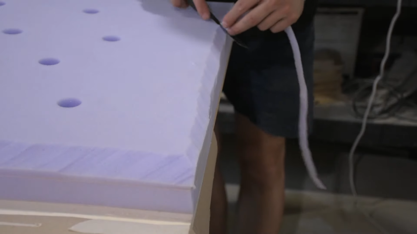 Затем срежьте верхний слой поролона по бокам изголовья под небольшим углом. |