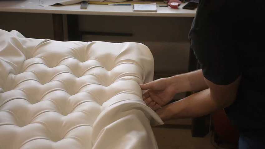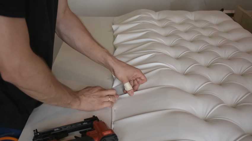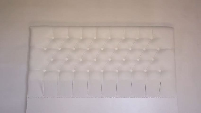 Накройте изголовье обивочным материалом и приступите к пришиванию пуговиц в обозначенных местах с помощью тонкой веревки и специальной иглы для каретной стяжки. |