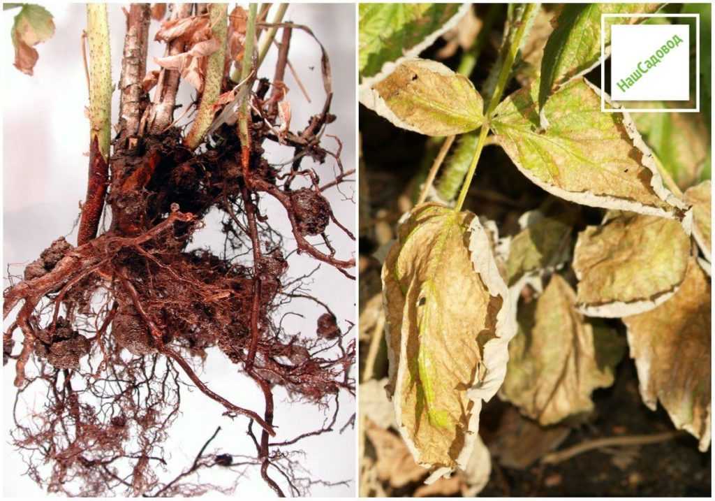 | Признаки | Тонкие побеги, пожелтение листвы, измельчение и сухость ягод. На корнях появляются коричневые наросты размером с горошину и до 3-5 см |