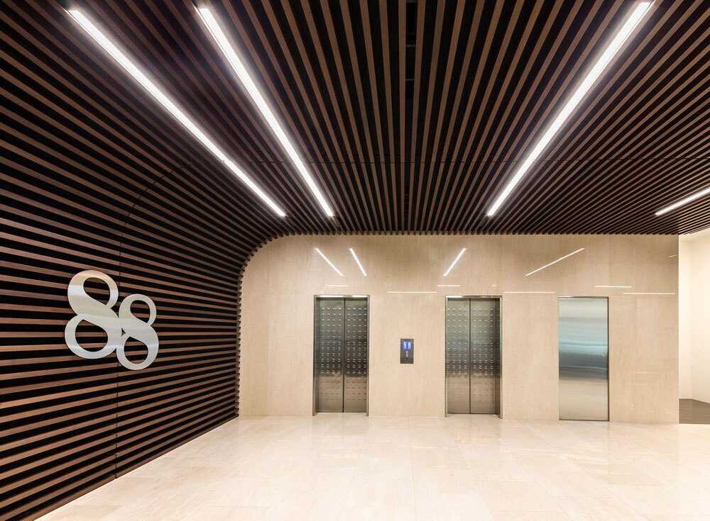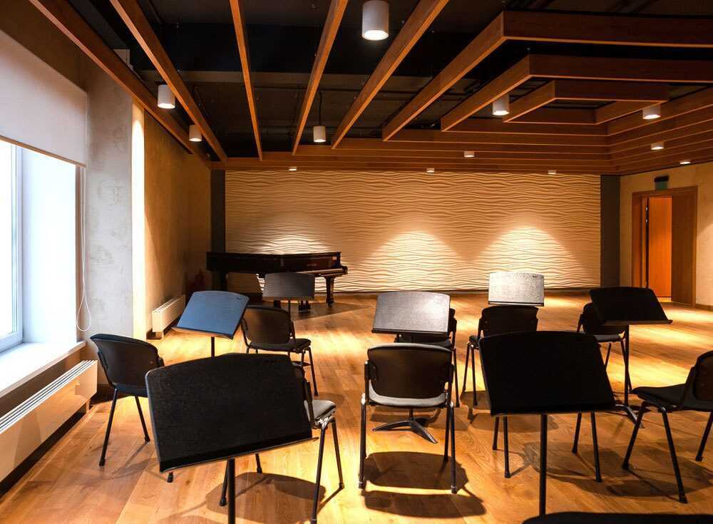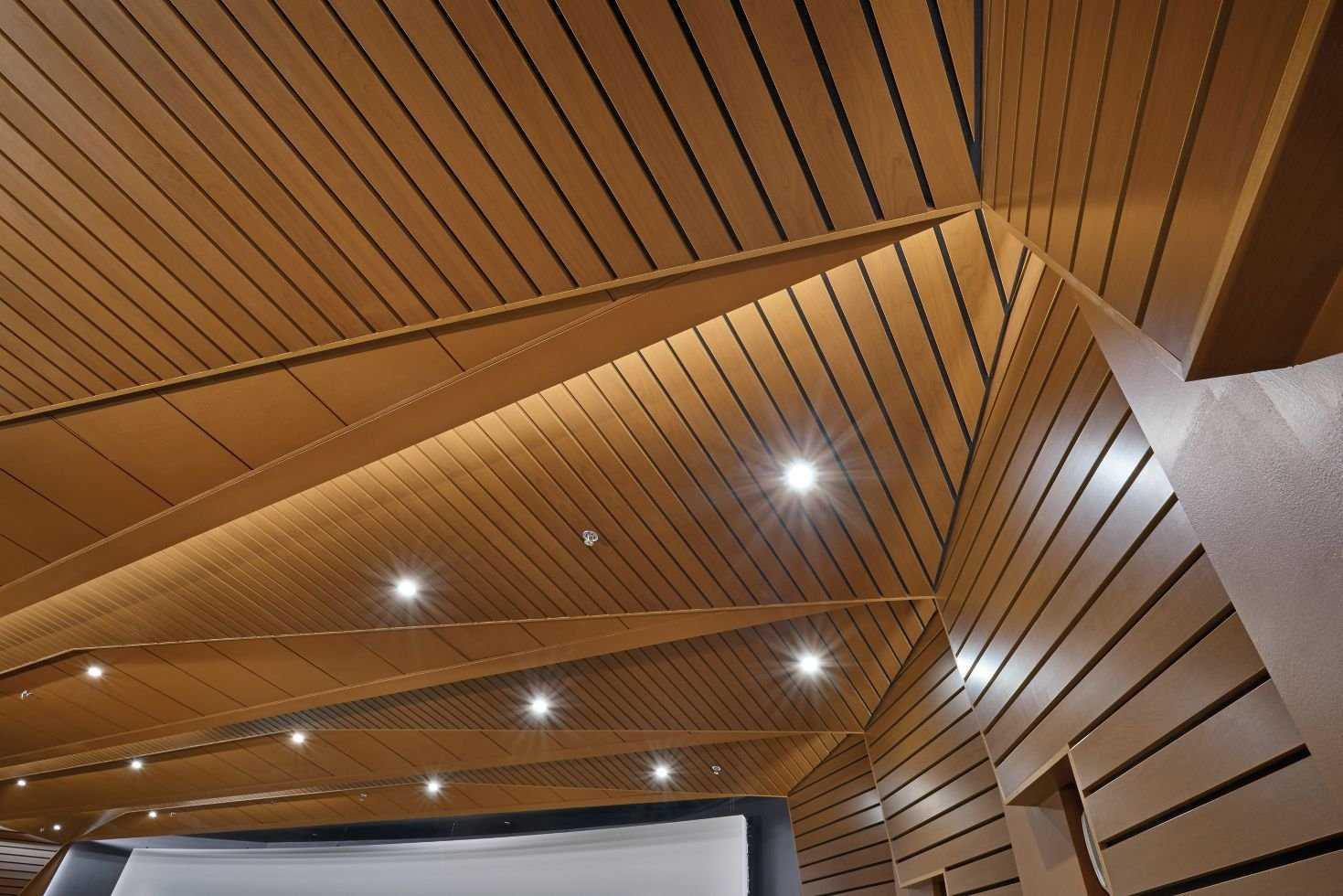 Чтобы создать наиболее эффектное оформление в просторных, высоких помещениях, применяют рейки из древесины различного цвета, создают множественные перепады высоты, монтируя сложный каркас на нескольких уровнях