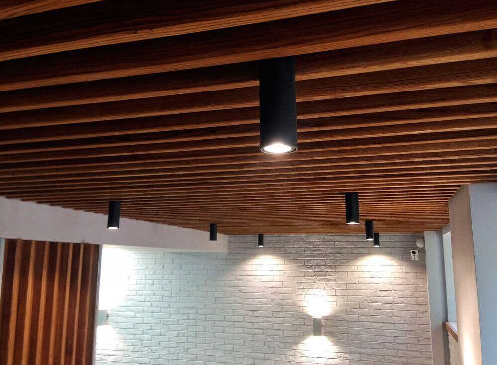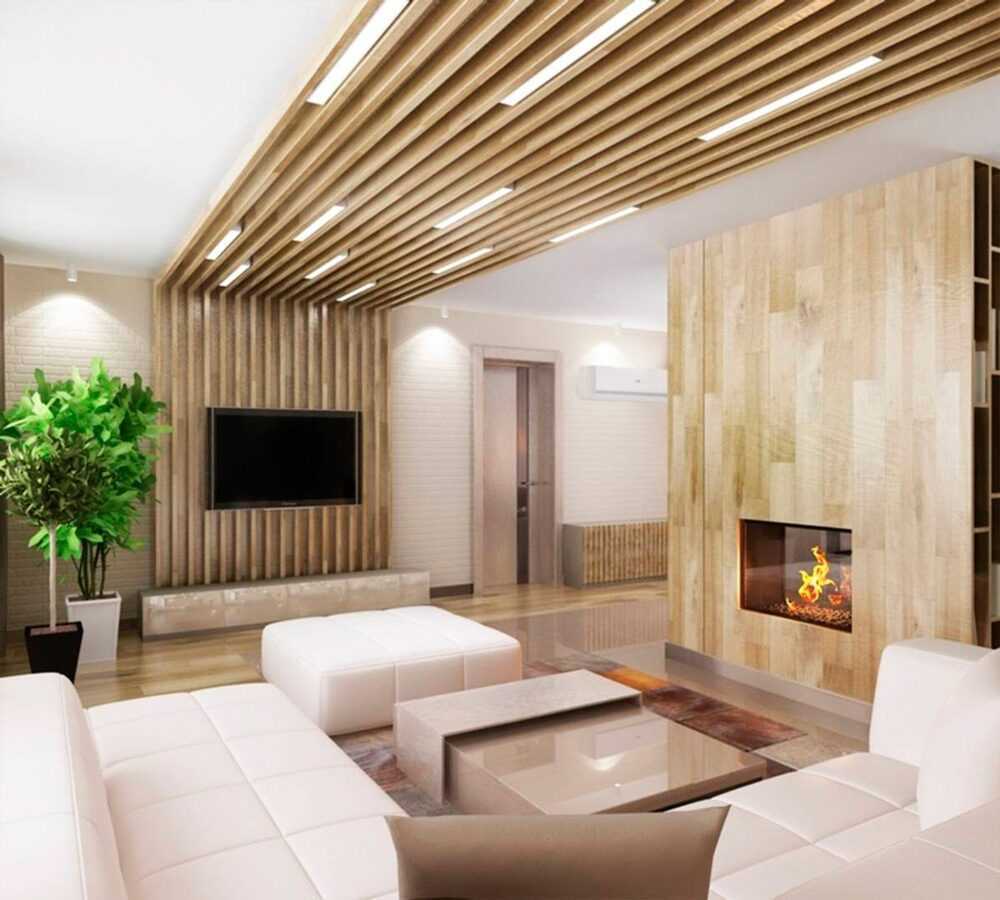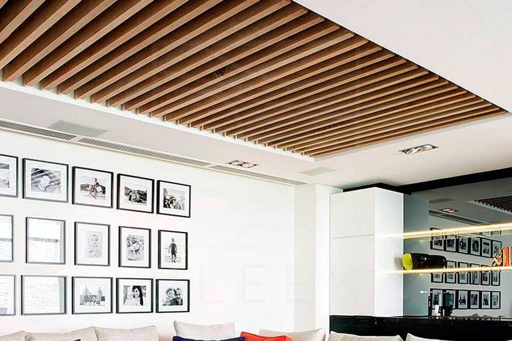 Для низких комнаток рекомендуются конструкции закрытого типа. Чтобы создать наиболее эффектное оформление в просторных, высоких помещениях, применяют рейки из древесины различного цвета, создают множественные перепады высоты, монтируя сложный каркас на нескольких уровнях.
