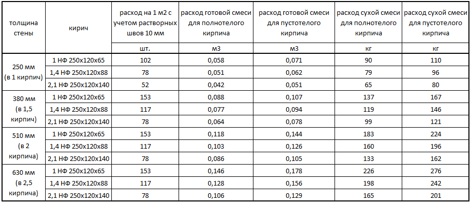 Расход цемента на кирпичную кладку, то есть сухой смеси, можно посчитать аналогичным образом, подставив нужное значение из таблицы в наши расчеты вместо расхода приготовленной смеси.