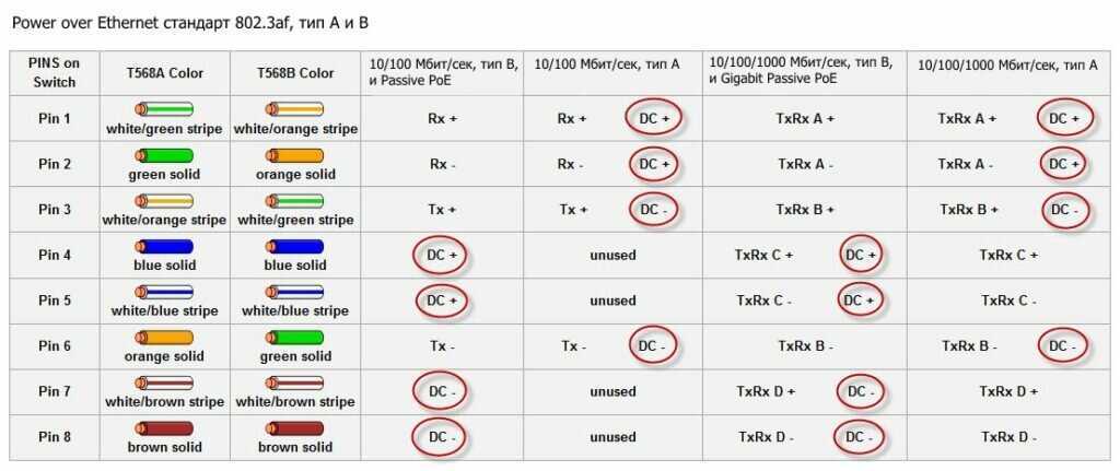 Если с обеих сторон сети установлены устройства, работающие в стандарте 802.3af/802.3at, расположение выводов не имеет значения, поскольку энергопотребляющее устройство может работать в обоих стандартах