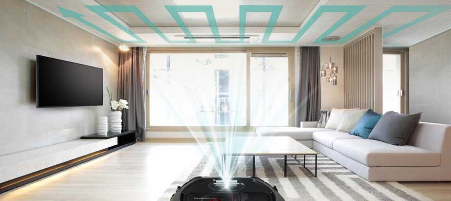- с помощью лазерного дальномера — основной способ: пылесос замеряет расстояние до препятствия с помощью лазерного луча, и рассчитывает, сколько он может проехать, чтобы не столкнуться с ним;