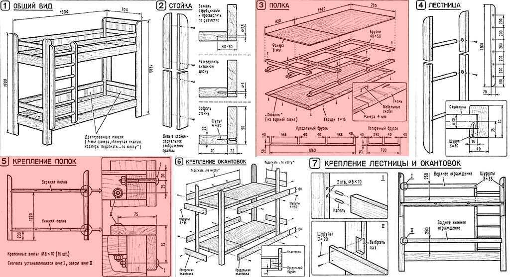 Чтобы собрать двухъярусную кровать из деревянных заготовок, выполняют такие шаги: