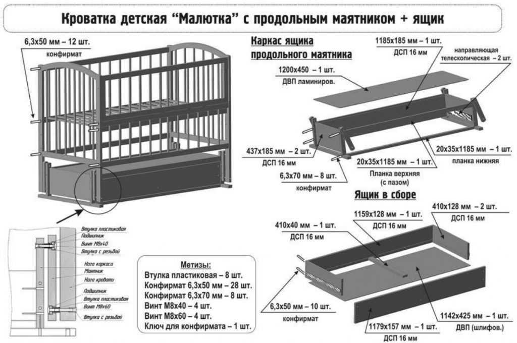 Если в конструкции отсутствует ящик, процедура существенно облегчается. Процесс сборки кроватки-трансформера с маятником проводится следующим образом: