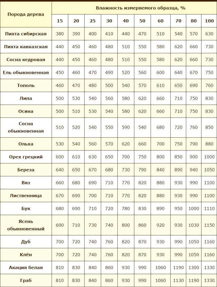 Обычно табличное значение плотности бруса и других пиломатериалов измеряется при влажности 12%. В зависимости от полученной величины, породы деревьев делят на 3 группы: