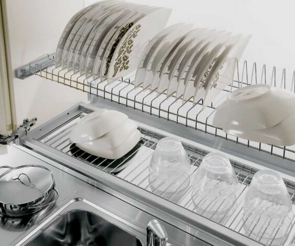 - Внутренние (встроенные). Компактное приспособление с местом установки внутри шкафчика. Оснащено двумя боковыми стенками, играющими роль каркаса. Устойчивость минимальная, поэтому производитель предусмотрел специальные крепления к боковым стенкам шкафчика. Относятся к категории безрамных. Выпускаются стандартного размера. Одним из конструктивных элементов выступает поддон. На него стекает вода с чашек и тарелок.