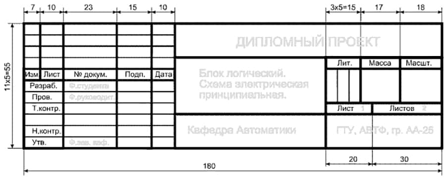 Все надписи, размеры положение элементов штампа установлены ГОСТом 2.104-68 (формы 1, 2, 2а, 2б и приложения, которые устанавливают разбивку чертежа на зоны и нанесение штампов для разных форматов бумаги.