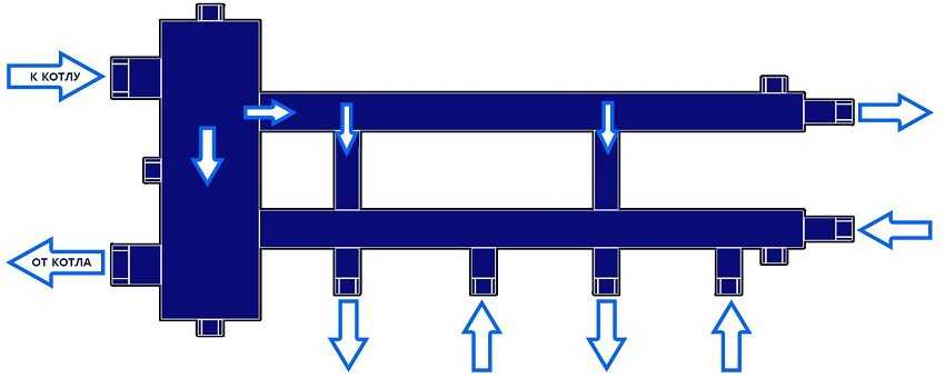 Самое важное – благодаря такому распределению в доме не останется холодных контуров, так как теплоноситель будет поступать в каждую трубу, а не только туда, куда проще. Принцип работы гидрострелки