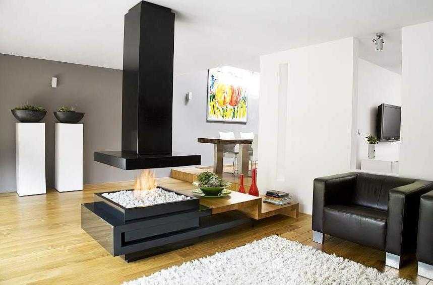 Новое веяние в дизайне, островной камин может быть использован не только как элемент декора, но и как обогревательный прибор. Он успешно справляется с зонированием пространства. Особенно в помещении, где гостиная совмещена с кухней, столовой или прихожей. Такой камин очень удобен тем, что вокруг него может разместиться большее количество людей.