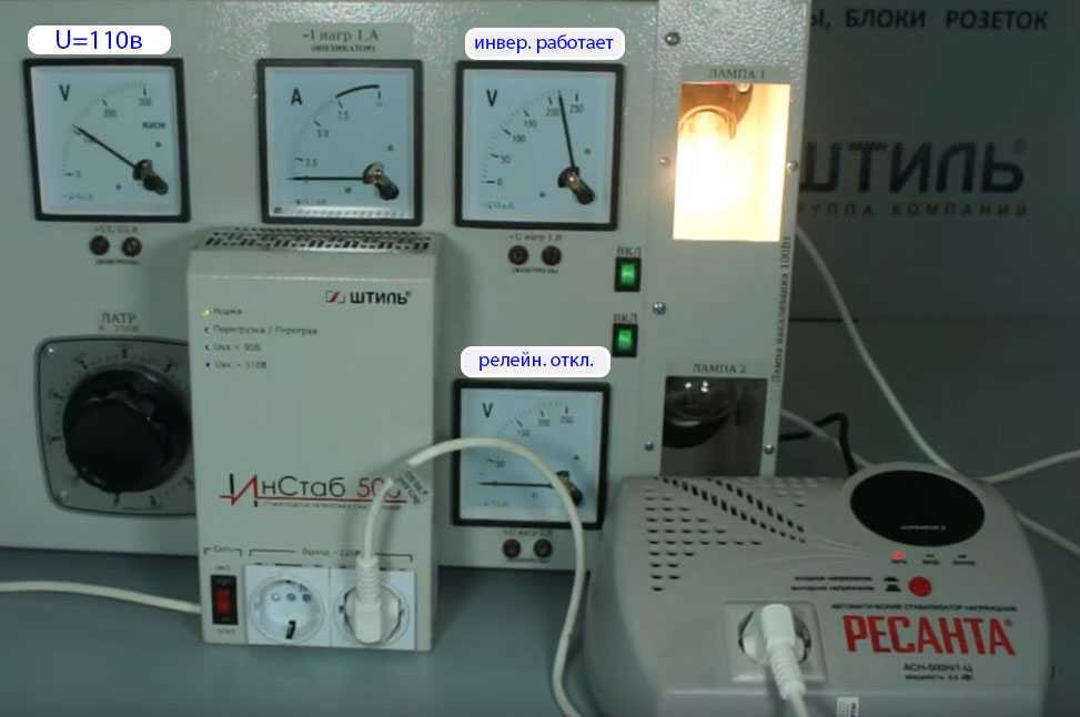Инверторный стабилизатор спокойно выравнивает параметры до нормы, начиная с просадок до 90В.