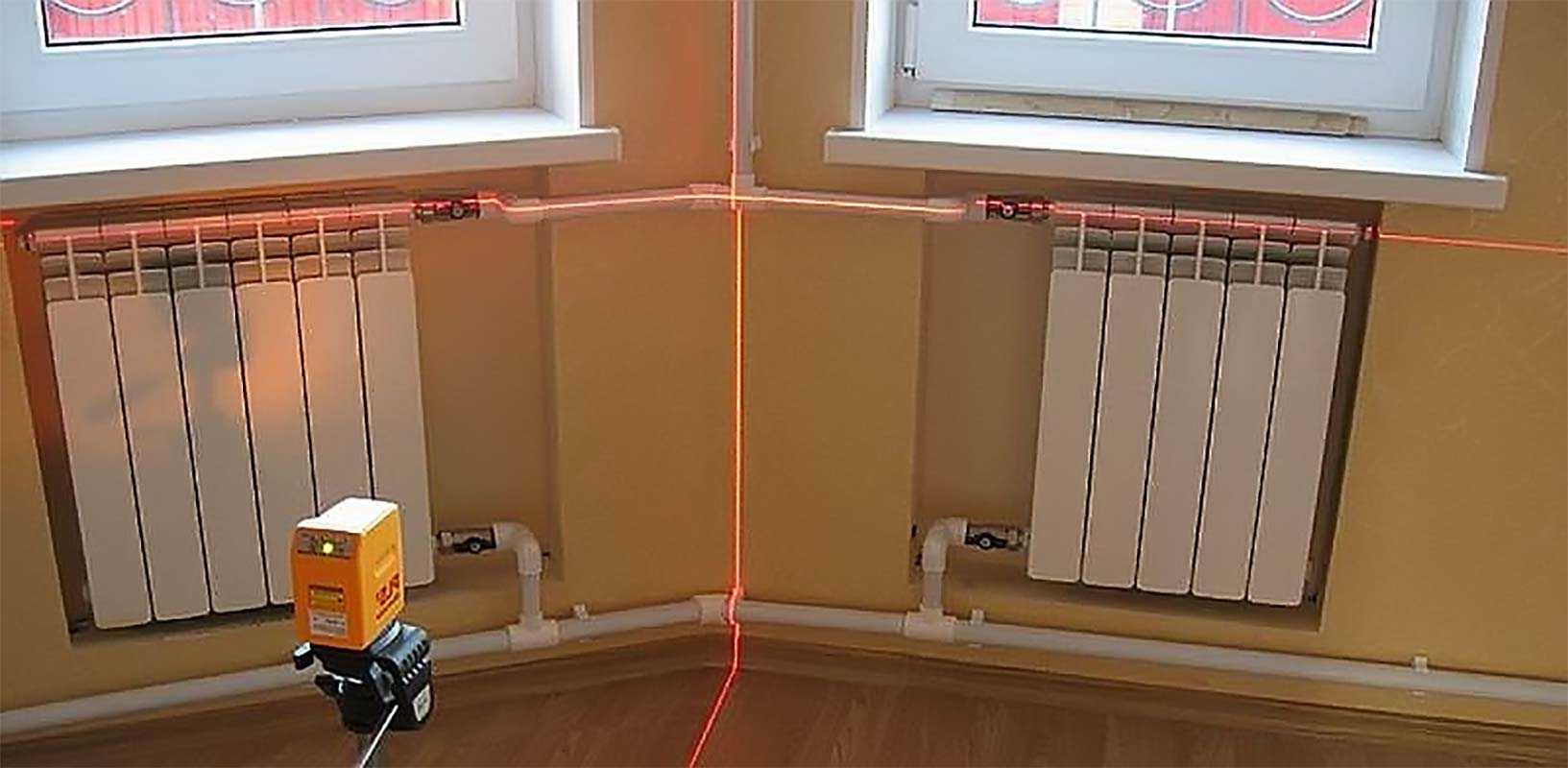 На участке намечается середина проема, под подоконником на расстоянии 10-12 см вычерчивается горизонталь. Вдоль этой линии в дальнейшем станет ровняться отопительный прибор. Размещать кронштейны следует таким образом, чтобы верх соответствовал начерченной линии, другими словами оставался строго горизонтально. Подобное расположение приемлемо для квартир и систем, использующих принудительную циркуляцию. По ходу теплоносителя в системах с естественной циркуляцией выполняется маленький уклон, равный 1-1,5 процентам. Превышать эти значения нельзя, иначе будут образовываться застои.