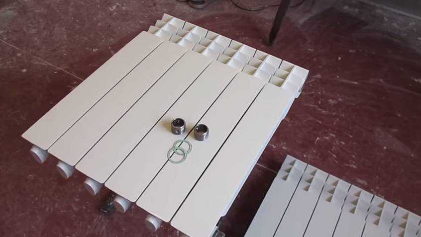 Алюминиевые, биметаллические, чугунные радиаторы собраны по одному и тому же принципу: секции в верхней и нижней части соединены между собой ниппель-гайками. Ниппель-гайки — это полые кольцеобразные гайки с внешней резьбой. Резьба нанесена на оба конца. Внутри каждой сделаны специальные пазы. В них при сборке-разборке вставляется ключ, вращая который происходит стягивание либо разъединение (в зависимости от направления вращения) обеих секций. Герметизацию обеспечивает прокладка из паронита или силикона, надеваемая сверху гайки.