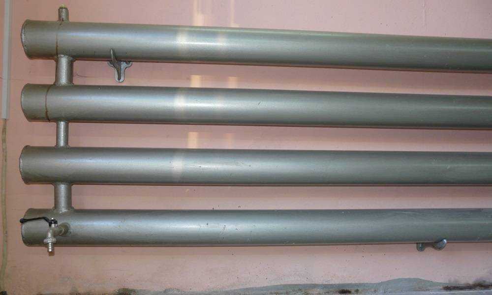 Перейдем наконец-то к самой конструкции. Чаще всего она делается из нескольких трубок — секций — которые соединены между собой отрезками трубок меньшего диаметра. Такой радиатор называется секционным. Иногда требуется придать ему дополнительную жесткость, это делается путем приваривания нескольких кусков арматуры.
