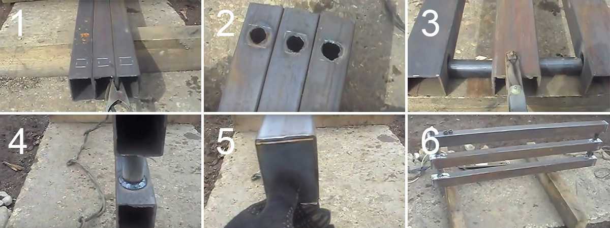 Наша задача заключается в том, чтобы соединить между собой четыре большие трубы с помощью перемычек. Для придания дополнительной жесткости добавляем перемычки из арматуры. Перемычки из трубы располагаем вблизи торцов – здесь можно отступить на 90-100 мм. Далее привариваем к торцевым частям наши заглушки. Лишний металл на заглушках отрезаем болгаркой или сваркой – кому как удобнее.