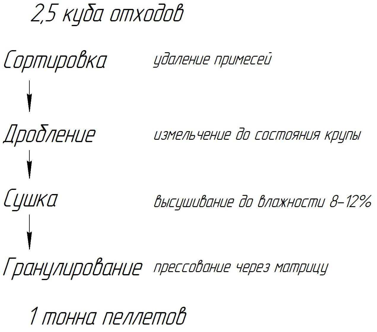 Свойства пеллет во многом определяются сырьем, используемым для их производства. В продаже часто можно встретить светлые и темные гранулы. Наиболее предпочтительным в плане энергоэффективности является использование светлых пеллет. Дело в том, что для их изготовления используется чистое сырье – опилки и мелкая стружка, обеспечивающие однородность состава топливных гранул. Что касается более темной разновидности, то ее производство подразумевает использование неотсортированных отходов деревообработки. В такие пеллеты вместе с опилками попадает измельченная кора, ветки, трава и даже грунт. Как примерно происходит процесс производства, можно посмотреть на технологической схеме ниже.