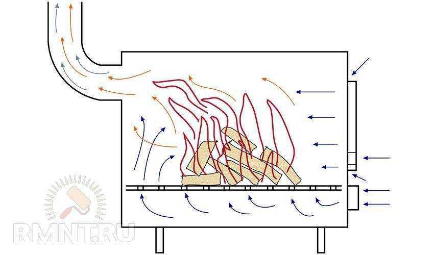 Без решётки кислород проходит только через приточный канал, который довольно точно регулируется. В результате увеличивается время горения и продукты лучше разлагаются. При этом горячий газ дольше задерживается в топке и эффективнее прогревает стенки. В результате больше тепла остаётся внутри помещения.