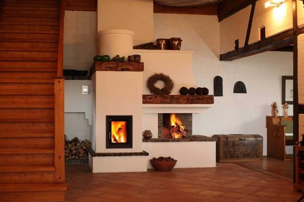 Часто такой вариант устанавливается в загородных коттеджах, где предусмотрено газовое и электрическое отопление, а вот в целях экономии ресурсов владельцы иногда пользуются кирпичной печью.