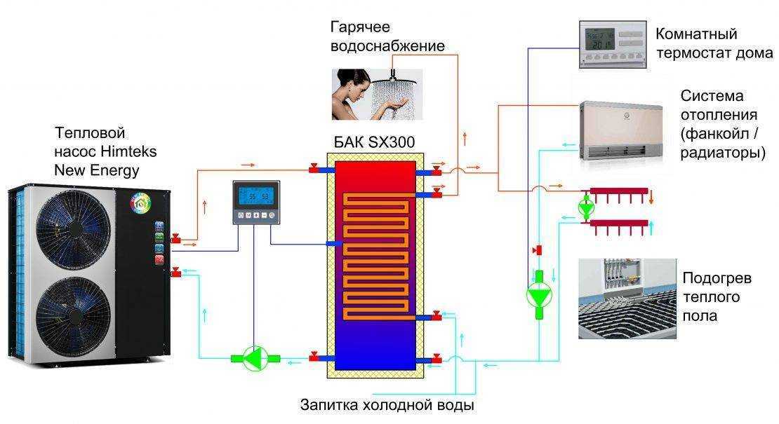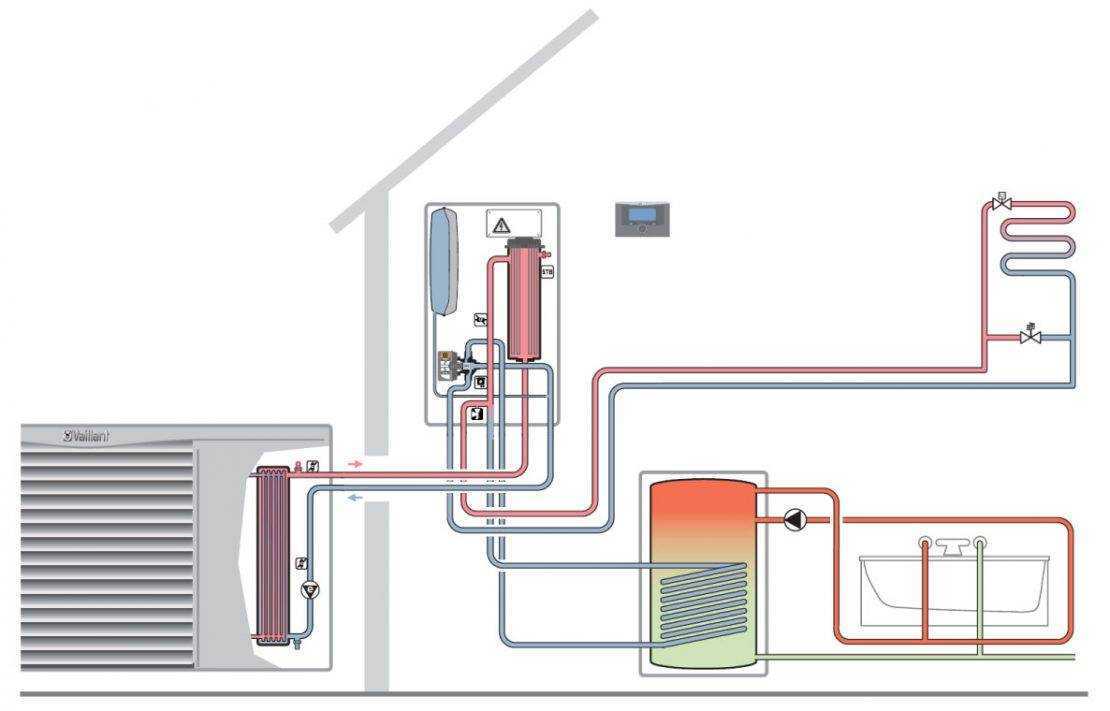 Система оборудования для воздушного отопления включает внутренний и внешний блоки, контур для перемещения хладагента, вентилятор с функцией нагнетания воздуха и трубопроводы (каналы) для транспортировки потоков воздуха.