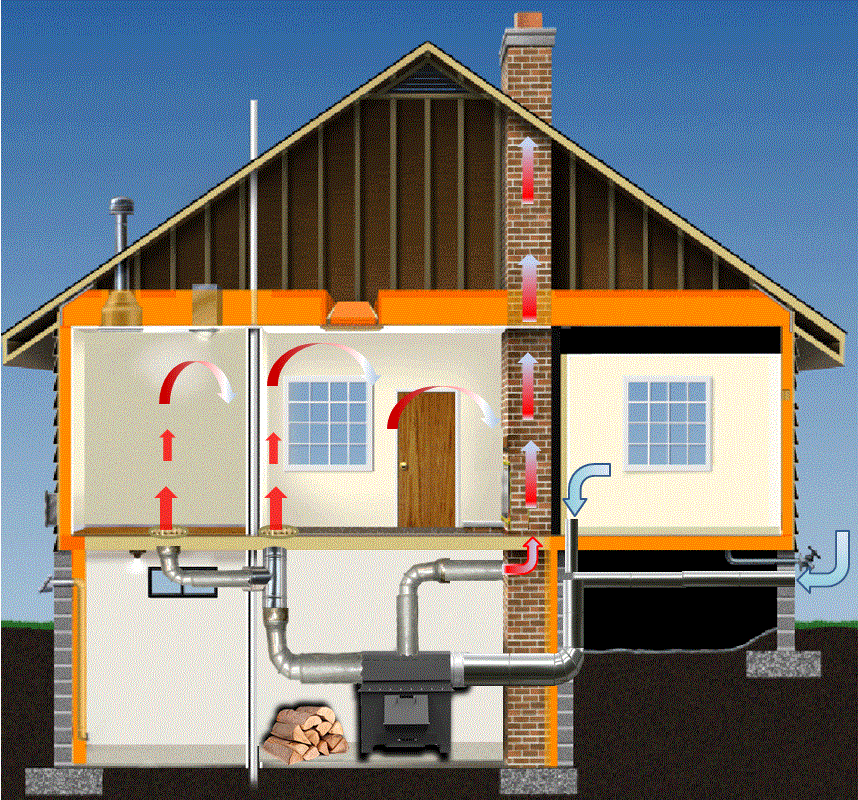 Можно сделать и такую систему, в которой горячий воздух будет перемещаться естественным образом, без всякого вентилятора. Однако эффективность работы таких систем обычно оставляет желать лучшего, поскольку помещения в этом случае прогреваются слишком медленно.
