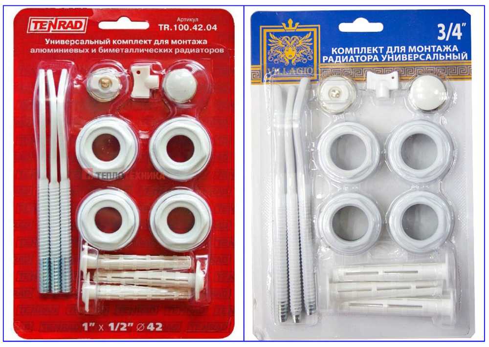 В торговой сети реализуют специальные наборы с переходниками (короткими муфтами с наружной и внутренней резьбой) для вкручивания в радиаторные отводы, в которые также входят кран Маевского, заглушка и крюки с крепежом для подвешивания батареи.