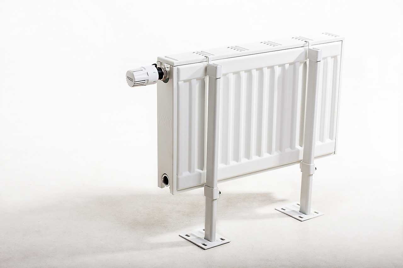 Такой способ монтажа встречается гораздо реже, чем предыдущий. К полу прикручивают стойки для батареи. Они могут держать конструкцию сами по себе, либо к ним прикручиваются держатели.