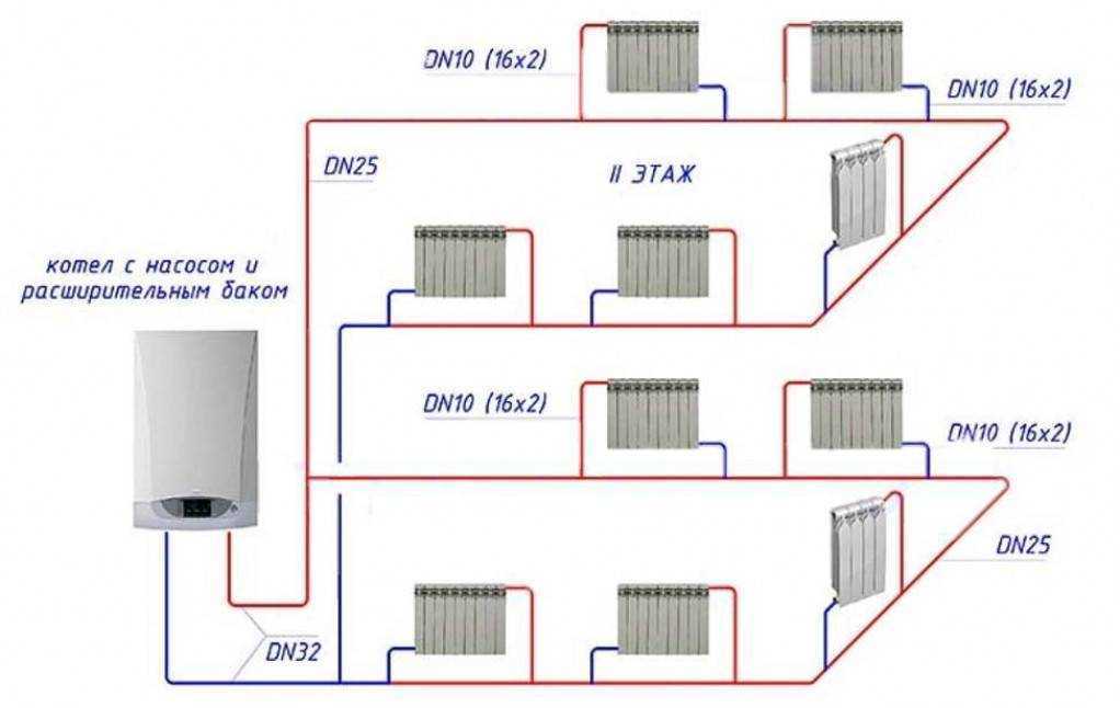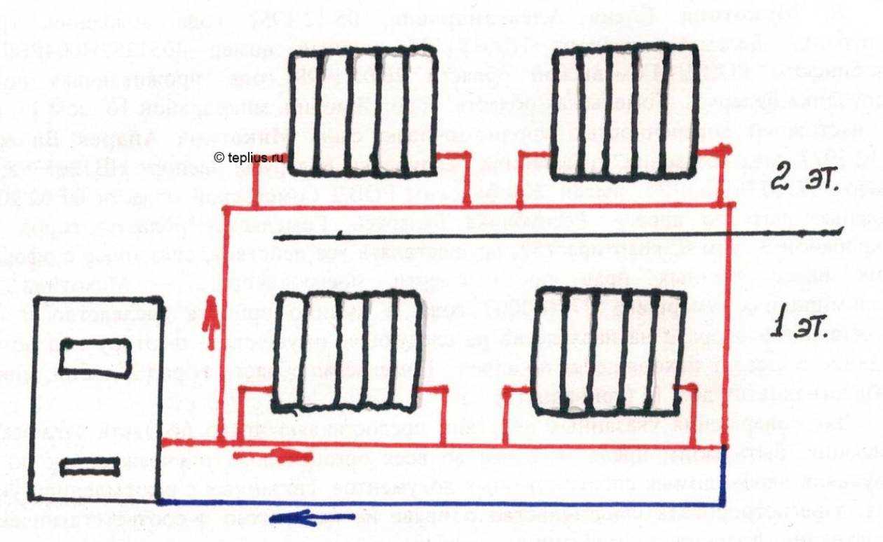 - Отопительный контур может быть обустроен на двух этажах. Такая схема получила название вертикальной.