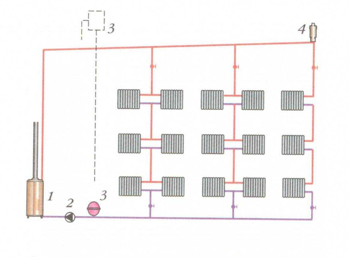 Рассмотрим горизонтальную закрытую схему отопления с принудительной циркуляцией.