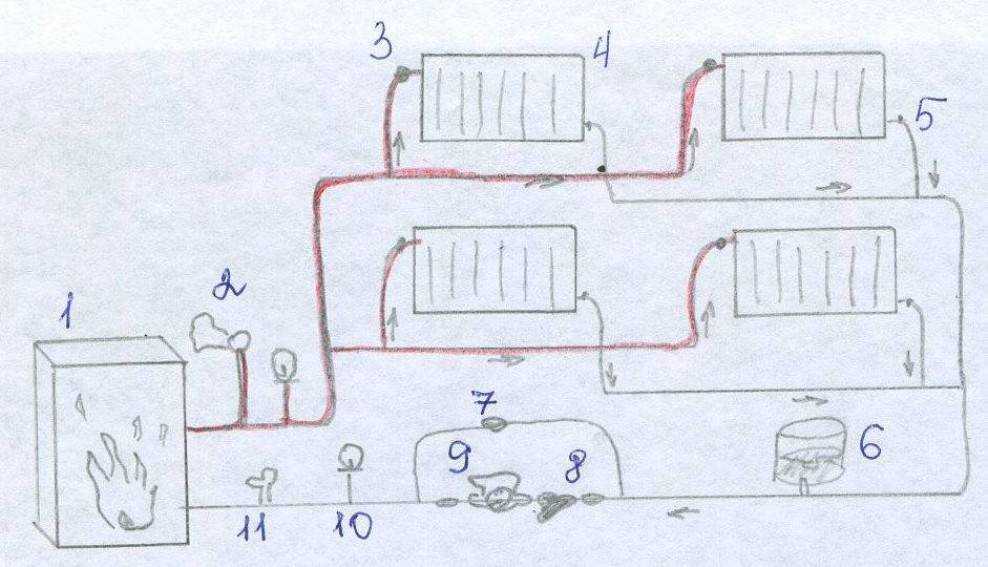 Также схема не предусматривает возможности регулировать теплоотдачу батарей, уменьшать температуру в помещениях или увеличивать ее. Усовершенствованная схема, приведенная ниже, решает эти задачи.