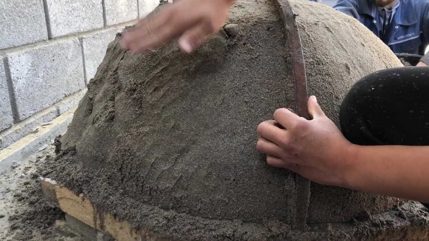 Дальше возведём саму помпейскую печь. Она будет в виде сферы. Основание сделаем из песка, промочим. Выровняем, воткнув в центр арматуру и проведя шаблоном вокруг.